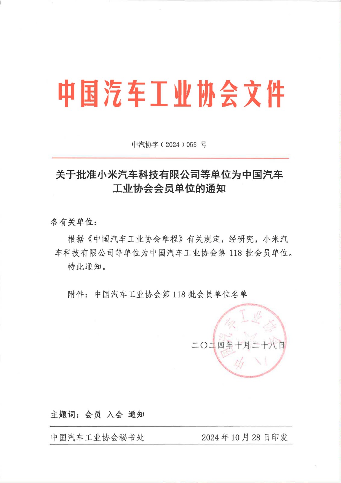 关于批准小米汽车科技有限公司等单位为中国汽车工业协会会员单位的通知