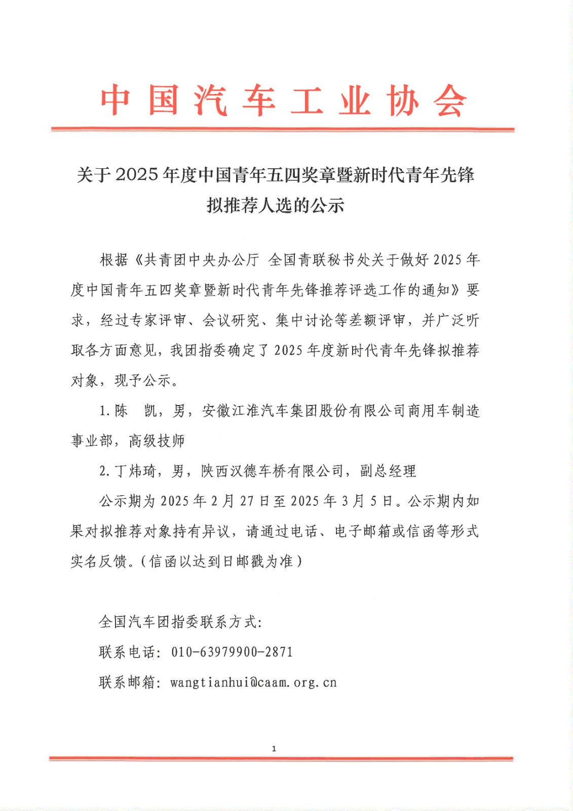 关于2025年中国青年五四奖章暨新时代青年先锋拟推荐人选的公示